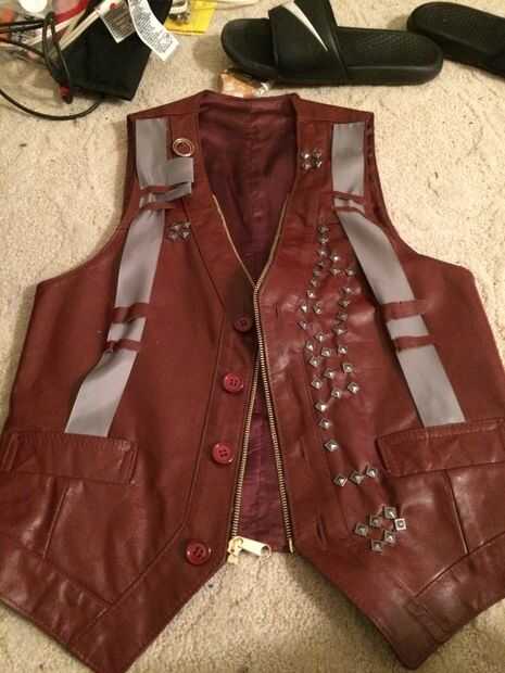 Tomar la tijera y cortar pequeñas presillas en cada lado del chaleco para la tela de plata. Tejer a la tela de plata a través de las presillas y pegar en su lugar en ambos extremos. Cortar un pequeño trozo de la tela y crear dos bucles poco para el lado derecho del chaleco.