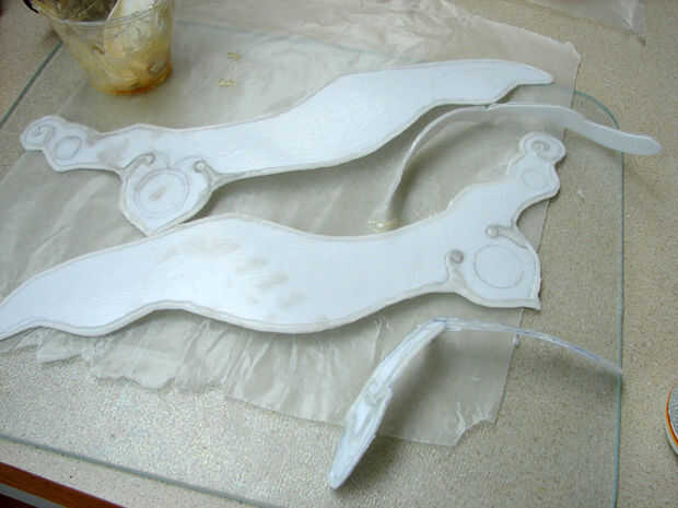 1) base: hice los pedazos más pequeños de un producto llamado Wonderflex. Wonderflex es un termoplástico que puede tomar curvas complejas bastante bien. Fácilmente se calienta para formar con una pistola de calor o una pistola de grabación en relieve o secador de pelo. Mientras está caliente, que se siente básicamente tela tiesa, así que es mejor formar sobre un positivo de algún tipo; Si se calienta un poco, usted puede doblar con las manos. Cuando haya enfriado, se mantendrá esa forma. Para las tapas de arranque, realmente podido calentar sobre la bota sí mismo con el pie en ella calienta para ablandar el material primero, y luego presionando sobre mi bota.