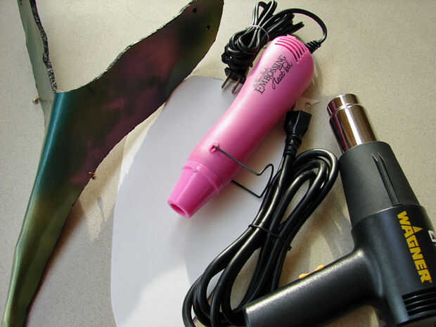 Sintra es fácil de formar con una pistola de calor (o sustituir una pistola de grabación en relieve, que es ideal para piezas pequeñas, o secador de pelo). Práctica con chatarra para obtener la cantidad adecuada de calor para conseguir la flexibilidad que desee sin haciéndolo llegar a ser demasiado flojo. Sintra tiene una estructura "celular" similar a algo como espuma, y si éste se sobrecalienta, esa estructura puede ser aplastada cuando te toque, dando por resultado una textura áspera. Usted puede quemarse en ella así que tenga cuidado o guantes, y nunca la forma directamente sobre la piel. Como siempre, nunca objetivo la herramienta de calor de su elección en su cuerpo; Usted puede obtener quemaduras mal incluso con secador de pelo. Si tus manos estarán en peligro, use protección (Ove guantes son buenos pero incluso un horno mitt va a hacer).