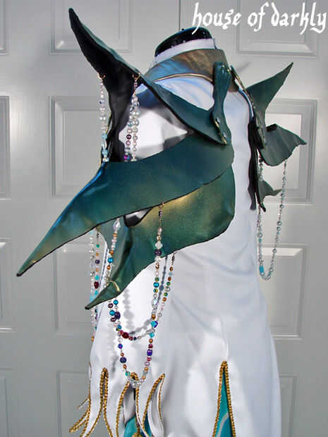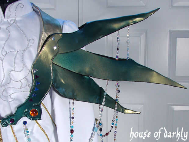 Las piezas fueron pintadas con verde metálico y luego oversprayed con oro (antes de que el respaldo fue agregado). Unen entre sí y con el resto de la vestimenta con tornillos Chicago (Self-binding posts). El personal en su ferretería no puede haber oído de ellos, pero es muy probable que tienen ellos - ocultar con los tornillos en algún lugar.