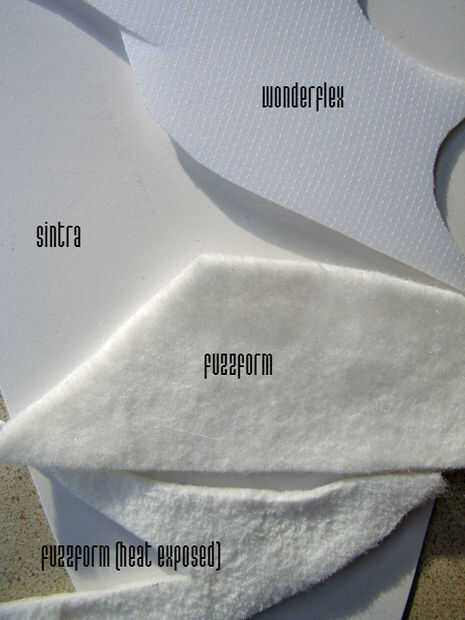 Fuzzform: Fuzzform es similar a Wonderflex, pero en forma de tela. Se siente como un fieltro pesado. Forma en el exacto enfrente de Sintra y el Wonderflex hacen; comienza flexible y se vuelve más rígido cuanto más se calienta. Una vez que se forma, realmente no puede ser reformado. Fuzzform es una marca; Creo que Fosshape es el mismo producto básico.