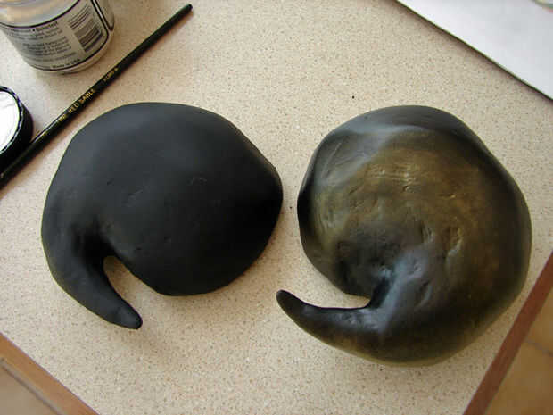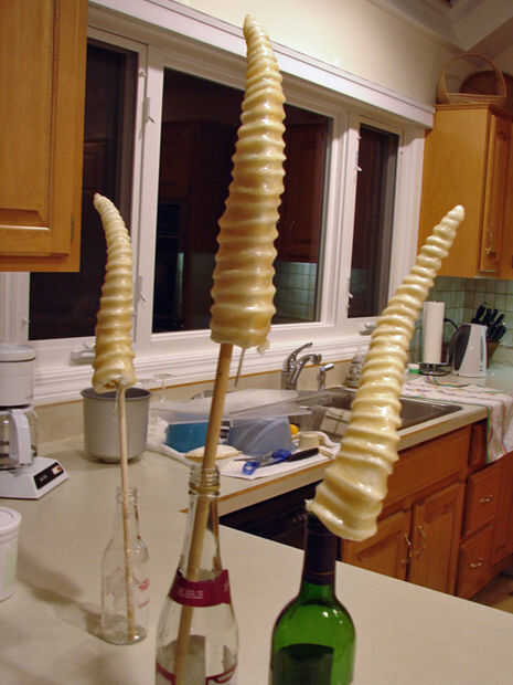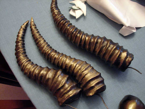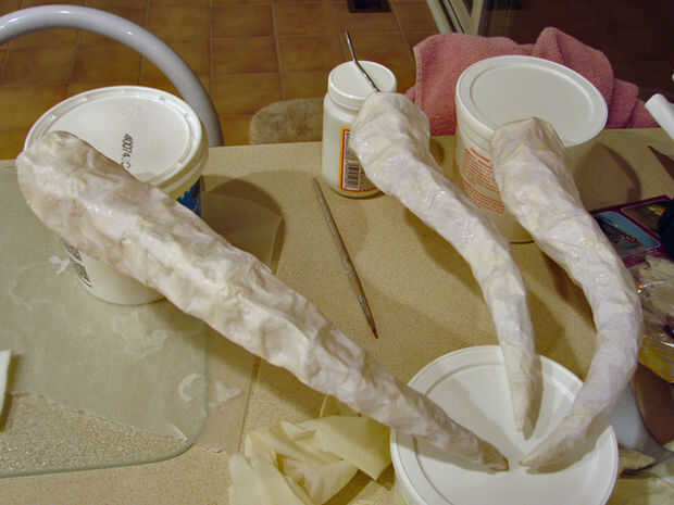 3) lisa de magia: Papier mache es muy buena y para algunos proyectos podrían parar después de la etapa de mache, pero quería una superficie dura, relativamente suave y cuerno-como. También criticó que no aumentar mucho el peso. Después de mucha investigación opté por usar un producto llamado magia suave. Es un epoxi de dos partes, pero es muy delgada, con una consistencia como caramelo (en una manzana, no los caramelos). Cuando se seque, es muy duro y es mecanizable. Las puntas muy de los cuernos se hicieron con otro producto llamado Magic Sculpt, una arcilla de epoxy.