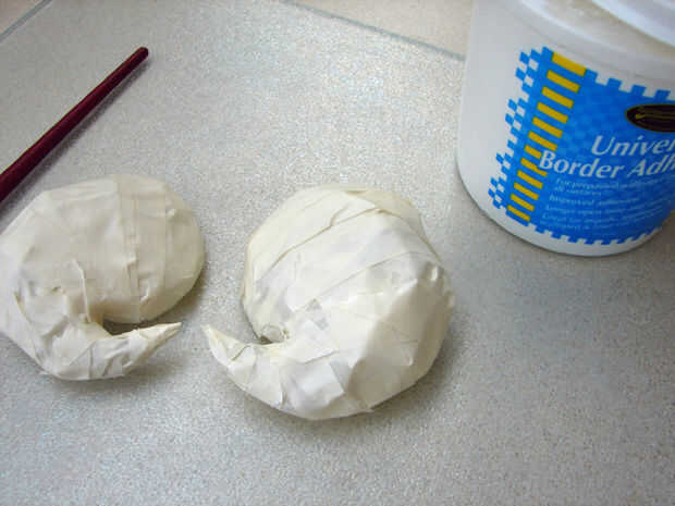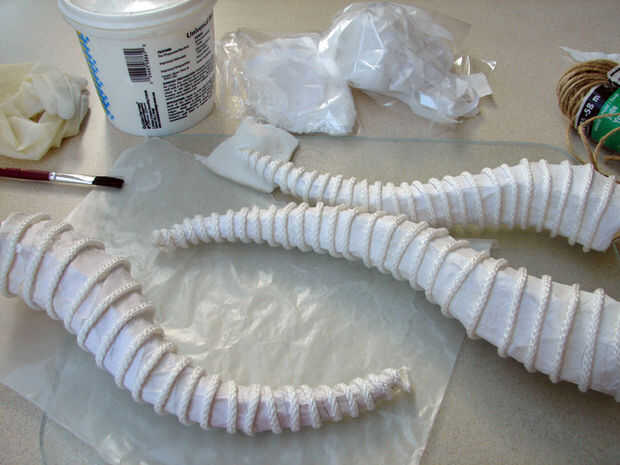 2) papel maché: para dar una base para el papel maché, envuelve el alambre con cinta de enmascarar. (Ghetto, pero funciona.) El papel maché es básicamente el mismo método aprendido en escuela primaria; Usé papel de seda, rasgado en pedazos de 2 "x 2". Yo uso pegamento de papel pintado, que viene barato en un bonito cubo resellable grande. En lugar de sumergir los trozos en el adhesivo, prefieren cepillo algún pegamento en mi superficie, a continuación, colocar la pieza y cepillar hacia abajo con más pegamento. Los cuernos de blesbok (largos) tuvieron un paso adicional para hacer las crestas, que utilicé algunos nylon cuerda que me ha pasado que tienen.