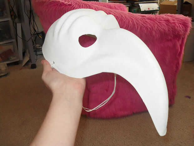 La mayoría de mis máscaras comienza con una tienda de cheapo comprada base para asegurarse de que los agujeros del ojo son simétricos y tamaño de la cabeza es aproximadamente correcta. En este caso, fui con una base de cartón estilo veneciano de nariz larga, pensando en que los largos de la nariz pueden ser fácil convertir a un hocico. Me decidí a alterar la forma existente de ojos para conseguir esos grandes ojos almendra. El cartón no era fácil de cortar, pero tener un borde limpio no importa en esta etapa inicial de construcción.