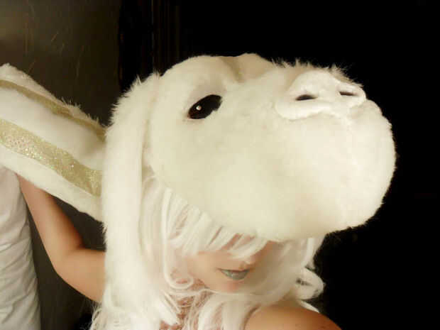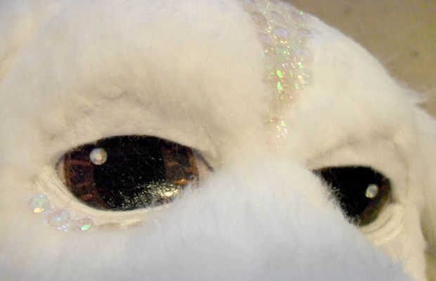 Los ojos son piezas de vinilo negro, pintado con acrílicos de arte cheapo. Instalé desde el interior y luego top cosido tapa blanco polar en frente para darle esa mirada de ensueño, sueño que siempre tiene. Esta foto no es el más grande debido a todos los blancos en blanco sobre blanco. Lentejuelas vintage de claro/blanco iridiscentes línea la tapa inferior para atar la la tela de escalas y la blusa del vestido. La nariz es realmente acudían con polvo flocado de Martha Stewart en cisne. He usado estaño gris para en las fosas nasales. He sido muy impresionado que después de todas las caricias ha conseguido que acuden está todavía intacta.