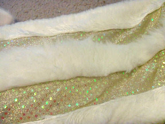 Usé mi máquina de coser para coser las tiras de "escalas" y de la piel en la parte posterior, luego mano cosen sus pequeños brazos y piernas fuera de la piel misma que usé en la cara. Pegué con cuidado hilo blanco pestañas a lo largo de los bordes de donde se reunieron las diversas telas para una transición más orgánica entre escamas y piel. Cosí las mitades dorsales y el vientre, usando el método de costura de máquina habitual de adentro hacia fuera.