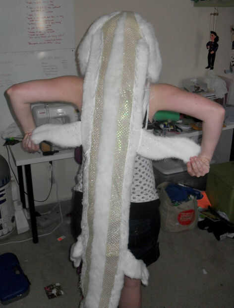 Hay valor fácilmente dos bolsas de polietileno-relleno interior del cuerpo, ligeramente lleno para reducir el peso y el calor. El tubo del cuerpo fue atado a la parte posterior de la cabeza utilizando E-6000, luego se fusionó con un peluquín de piel blanca. He cosido Este pedazo de puente en su lugar y elegido para una transición bastante la piel. La segunda foto es la parte inferior del Falcor. Usted puede ver donde el cuerpo se encuentra con la cabeza y donde he escondido todos los bordes y conexiones con la piel. Si te fijas bien en el centro de la espalda del "cráneo", verás una abertura en el papel maché. Generalmente hago uno o dos de estos en cada máscara para que puedo usar mini pinzas para aplaudir la máscara en su lugar en mi cabeza sin utilizar ningún dorky buscando correas elásticas.