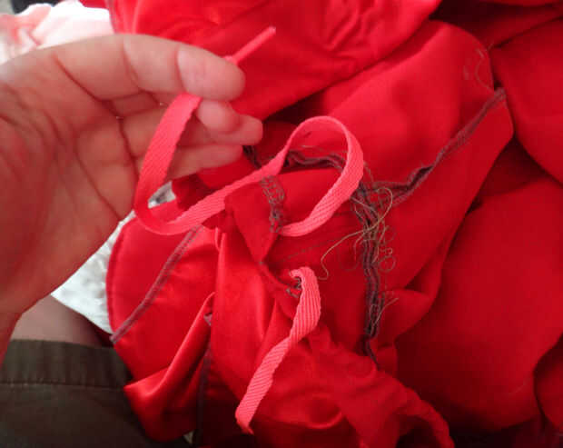 - crear volantes: una vez que la tira larga de tela, coser una línea muy floja cerca del borde. Una vez que se realiza lentamente tire 1 de los 2 hilos recogiendo a la tela con él creando un efecto de volantes. Terminada la colmena a la longitud necesaria para forrar el borde de la falda, coser la recogida del volante otra vez para asegurarse de que permanece.