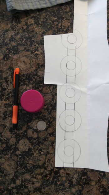 En primer lugar usted necesita hacer la plantilla de patrón. Lo hice por trazado alrededor de una tapa de botella de vitamina para el borde exterior de los círculos y un níquel para el borde interior. Sólo los círculos del espacio tan uniformemente como sea posible y conectar con las líneas rectas.