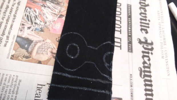 Para detener la pintura de va a través de la tela y estropear el otro lado, estirar la sección que desea trabajar en sobre algo como cartón o una tapa de recipiente de almacenamiento.