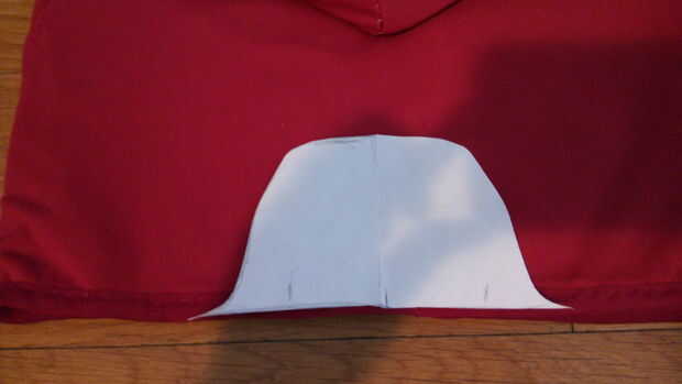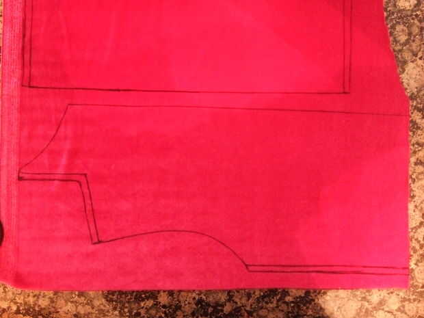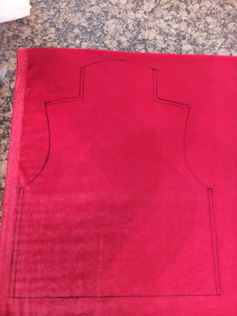 Trazar el patrón delantero sobre la tela de color rojo y marrón, luego Dale la vuelta y remontar otra vez en cada tela. Añadir márgenes de costura.