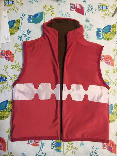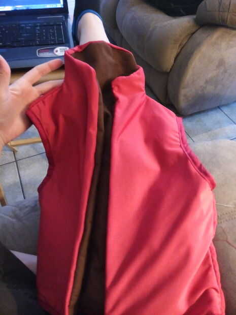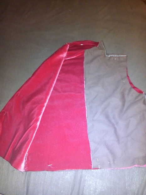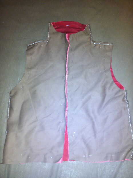 Tienes 1 trasero y 2 piezas delanteros en rojo y lo mismo en color marrón. Gírelas para que lados mal mirar hacia afuera. Se alinean las piezas delanteras con la pieza posterior. Perno en su lugar. Coser el borde del cuello hasta el final del hombro justo donde comienza el orificio del brazo y de la parte inferior del orificio del brazo a la cintura a cada lado. Hacer esto para el rojo y el marrón.