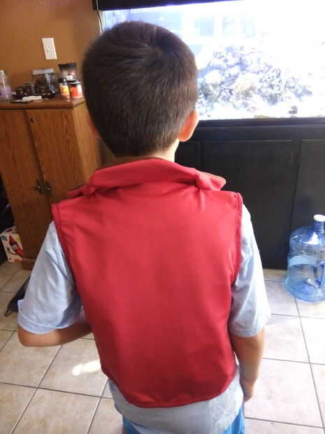 Alinee los dos chalecos con el revés contra revés hacia fuera, derecho contra derecho en. Prender juntos y coser de un hombro, alrededor del cuello y en el otro hombro y luego desde justo debajo del brazo hacia el lado hacia abajo en ambos lados. Voltear el chaleco adentro hacia fuera para que los lados derecho están hacia fuera. Línea y pin. Coser todo alrededor de los orificios del brazo y la parte inferior.