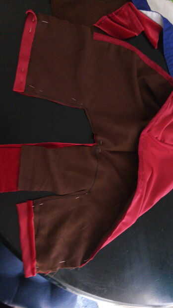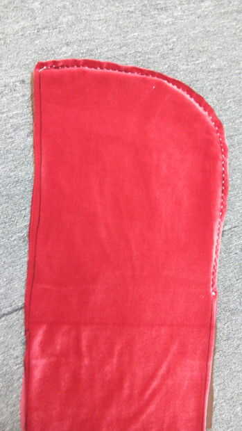 Alinee los tintos, pin y coser todo el borde curvado hacia abajo la mitad como se muestra en la foto.