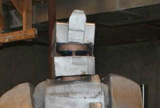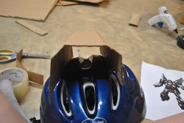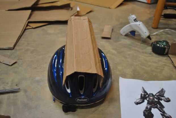 Para este paso, tome su casco viejo y realmente evaluar si va a trabajar. Comencé con un antiguo casco de la bicicleta, pero dejé de usar porque era tan espesa que hizo el cartón en superior ir demasiado alto. Si me hubiera pegado con esto, habría terminado para arriba con un transformador bobble a la cabeza. Pero en serio, encontrar algo que no sea demasiado gruesa y le quede la cabeza bien. Al final salió y consiguió un recipiente de plástico barato. Estaba un poco cómodamente, pero oh bien. Cabeza de Silverbolt tiene un rectángulo afilado encima de su cabeza. Una vez que se corta fuera, encontrar algunas piezas planas de cartón y pegar por lo que viene en los lados. Luego tome un pedazo lo bastante grande como para cubrir todo el rostro excepto los ojos y acoplarlos a las piezas de lado. Ponga unas gafas de sol azul y usted está listo para ir.