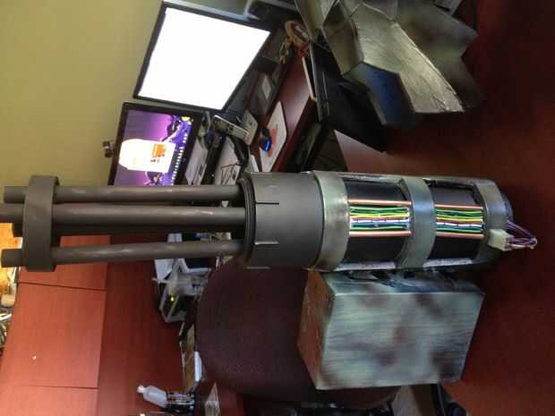 Ahora he añadido algunos detalles a la pistola. He creado una caja de munición de una pequeña caja de cartón. Cubierto en cinta. Rocía el interior negro mate y el camuflaje exterior. Poner 2 capas de poliéster en el exterior. Luego lo había jodido al lado de la pistola. Entonces pegué algunos hilos del cable que tenía en la parte inferior de la pistola. Enmarcado el cableado con 2 pajitas cortadas por la mitad y pintado cobre. Pegamento caliente se utilizó para pegarlas. Finalmente compré algunos falso cinturón de munición en la tienda de Halloween. I cortar una ranura en el lado de la pistola y había pegado a la primera ronda de munición falsa en la ranura y había cubierto el resto de la munición en la caja. Usé un poco de percha doblada en un arco para levantar la primera 8" o la munición en un arco. Esto fue usado en mi antebrazo y a como como fue unido a mi brazo.
