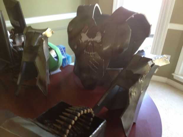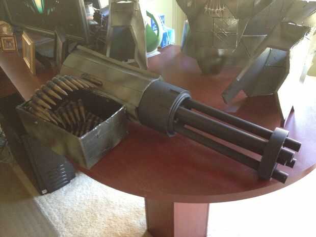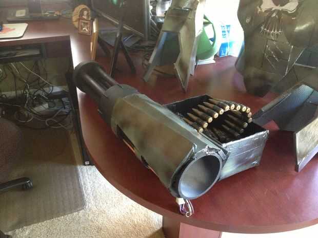 Ahora para hacer el arma. Esta hecha de PVC, una tapa de PVC de 4" y rosca limpia hacia fuera de pieza y 4 24" 3/4 "tubos de PVC cortan en tiras de 14". Corté el tubo de 4" a mi largo del antebrazo. Luego perforé la tapa de PVC con un 3/4" poco espaciada uniformemente alrededor de la tapa y un 5 º agujero el centro muerto. Usé esa plantilla para crear círculos de espuma del mismo tamaño y los orificios en el mismo lugar. Las piezas de espuma se pegan luego cubiertas con pegamento para madera para endurecer. Entonces corté otro trozo de 4" PVC ligeramente más ancha que el ancho de las 2 piezas de espuma de espalda con espalda. Inserta el disco con los agujeros en el 4" PVC y caliente lo pegado en lugar. Luego inserta cada 3/4" tubo en esta pieza y encamina a la tapa roscada de 4". Luego enrosca la tapa en limpio pieza y luego la limpieza pieza en el tubo de 4". Entonces este spray con 2 capas de rociador negro plano. Luego fabricó un guantelete de clases que estaba pegado a la 4" PVC y pintado en un patrón de camuflaje y poly le.
