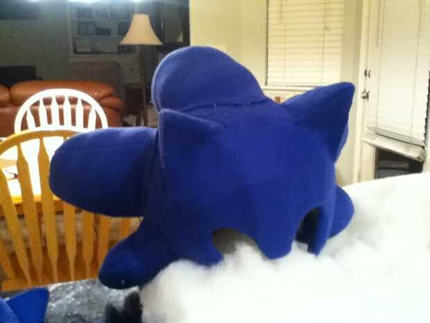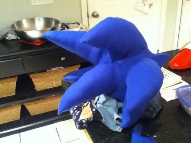 Ahora para hacer las puntas. Esto es una forma de cono básico cosida. Sin embargo, debido a picos de Sonic no se peguen hacia arriba tienen que ser curvado un poco. Probamos esto con papel primero para obtener una plantilla antes de cortar el paño grueso y suave. Una vez formados, los rellene con guata (hemos utilizado una almohada vieja). Entonces caliente pegue los picos en el lugar. Iniciar en la parte superior y trabaje su manera abajo asegurándose de que el paño grueso y suave del estiramiento apretado. Hacer esto para todos los picos. Las puntas frontales son más grandes que los picos de la espalda.