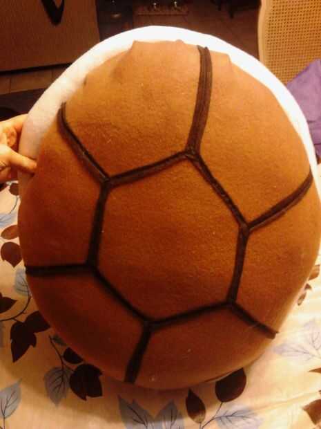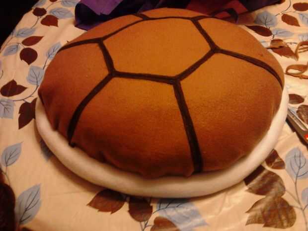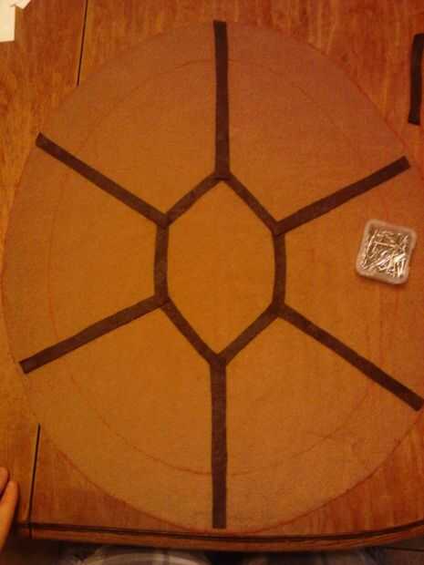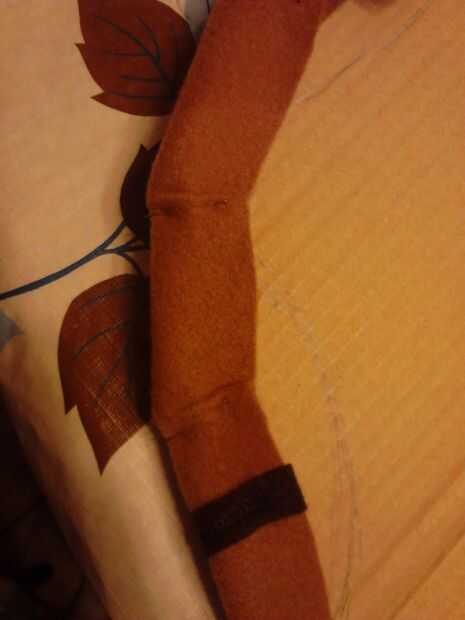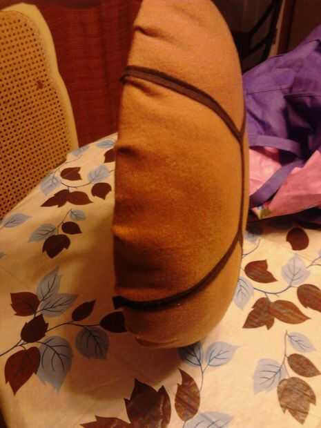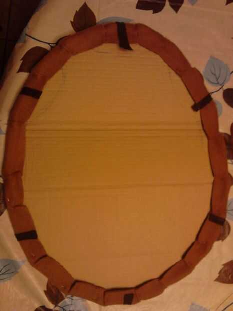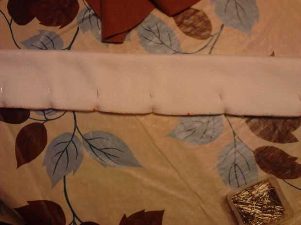 Ahora la parte difícil. Plegar los bordes del óvalo sobre el cartón oval en secciones. Donde las secciones se superponen, pin juntos. (ver foto). Cuando todo el óvalo es doblado sobre y cubrió, caliente pegamento en su lugar a lo largo de la parte inferior y a ambos lados, pero deje la parte superior sin pegar. Luego llene la cáscara con la fibra de poliéster relleno a su buldginess deseada y pegamento caliente las partes restantes. Ahora debe tener una concha marrón bastante impresionante.
