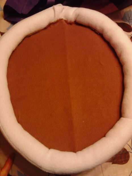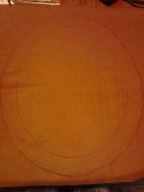 Cortar el óvalo y trazar sobre el paño grueso y suave de color marrón. Recórtalo y apartar. Trace lo otra vez dejando aproximadamente 3 pulgadas de material alrededor del óvalo. Use una regla para medir 2 pulgadas desde el óvalo y marque con un punto. Repita todo esto alrededor del óvalo, luego conecte todos los puntos. Ahora debería tener un óvalo dentro de un óvalo más grande. (ver foto) Corte a la línea del óvalo más grande.