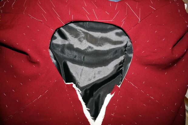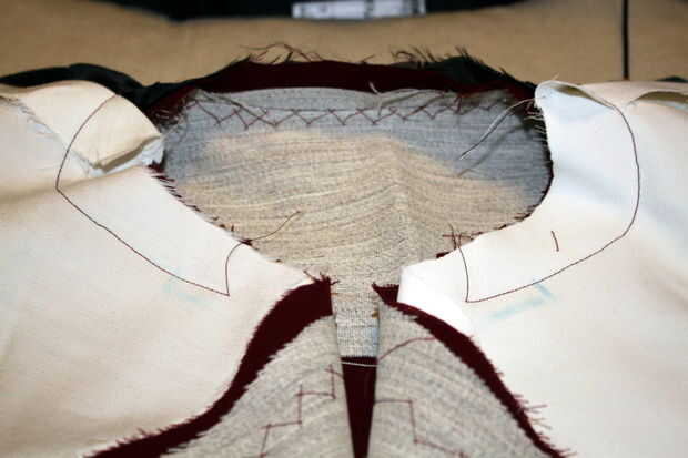 a. Coloque el forro y concha collares derecho lados juntos. Doble exceso de revestimiento del centro de la espalda y coser de ½" más allá de la muesca de la parte delantera derecha donde una combinación/b a la parte frontal izquierda de la muesca donde A / B Únete (este ayuda a convertir los márgenes bajo vinculantes más adelante). .