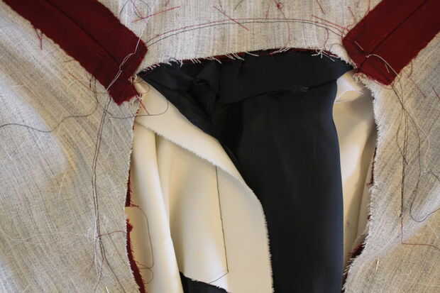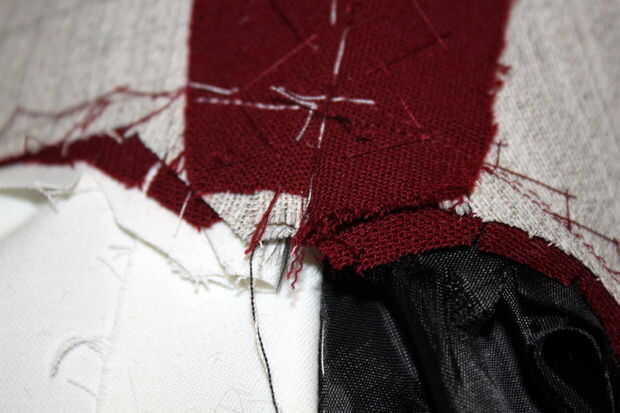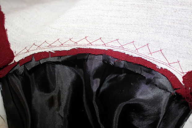b. Pulse margen de costura hacia el forro y coser dentro de costuras, cambio de color de hilo para que coincida con la tela de forro y Departamento