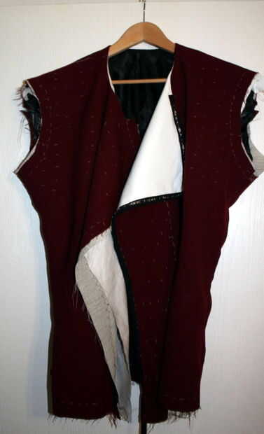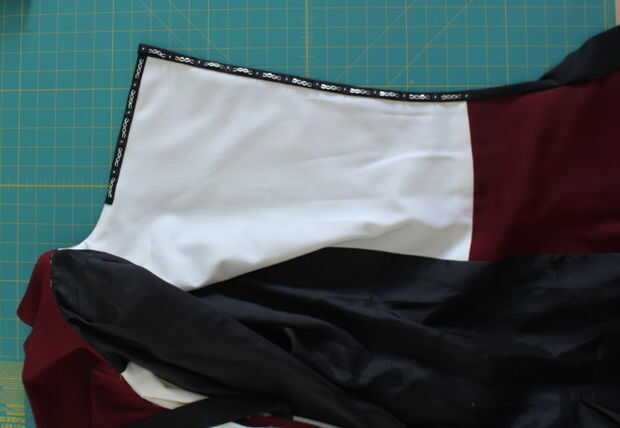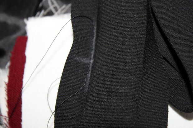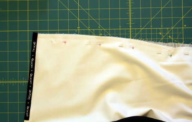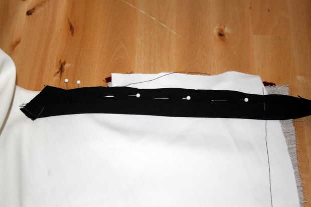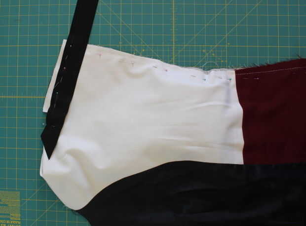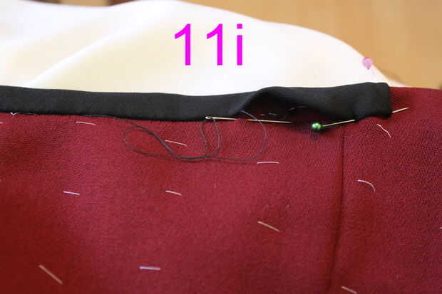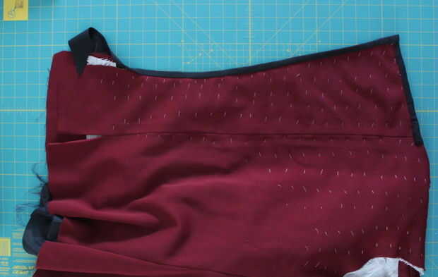 j. deja una cola de 1" en la parte superior y poner enlace en vertical interior izquierdo delantero, derecho contra derecho juntos. Alinee la línea de costura con costura de tela de encuadernación.