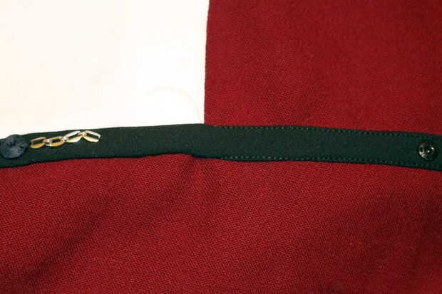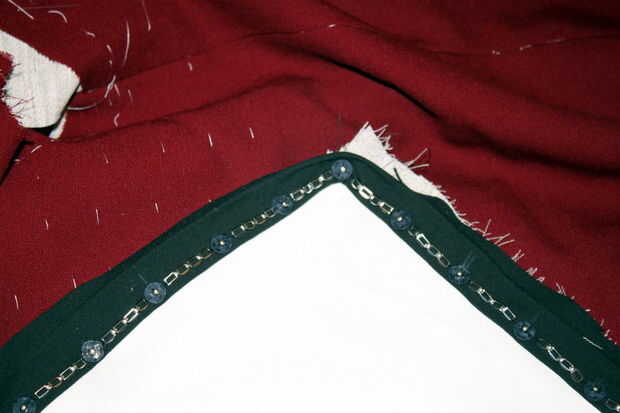 f. agregar complemento siguiente en 1½" de poste a poste. Si usando coser broches de presión, asegúrese de que la costura no se ejecuta por el borde exterior de la Unión. Continúe añadiendo encaje en parte superior, después de cada presión (esto asegura bordes no arrugarse más adelante cuando se cierra la chaqueta).