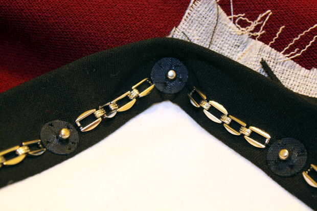 h. agregar complemento siguiente en 1½" de poste a poste. Si usando coser broches de presión, asegúrese de que la costura no se ejecuta por el borde exterior de la Unión. Continúe añadiendo encaje en parte superior y borde a la cintura, midiendo después de cada presión (esto asegura bordes no arrugarse más adelante cuando se cierra la chaqueta).