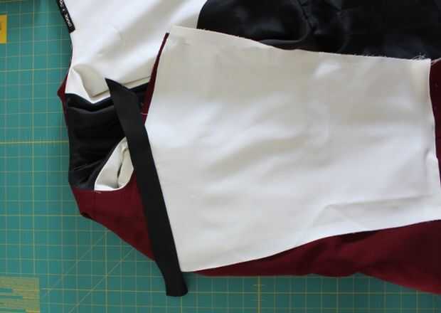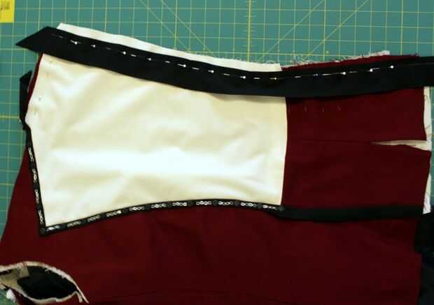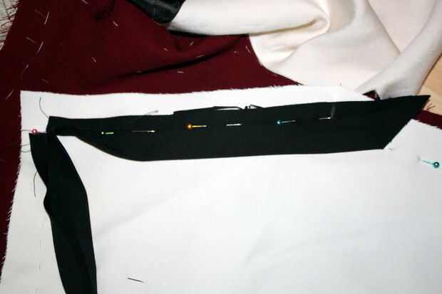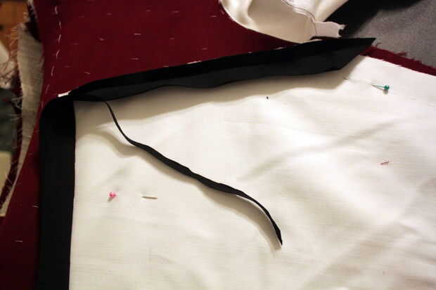 g. comenzar la costura vinculante vertical en la punta de la A / B de la línea de costura, girar y continuar coser vinculante en su lugar a lo largo de la línea de costura, girando en la esquina y plegable tela sobrante fuera del camino, hasta el fondo de K. Dejar la cola por la Unión a continuar a la parte inferior de la chaqueta para el posterior montaje.