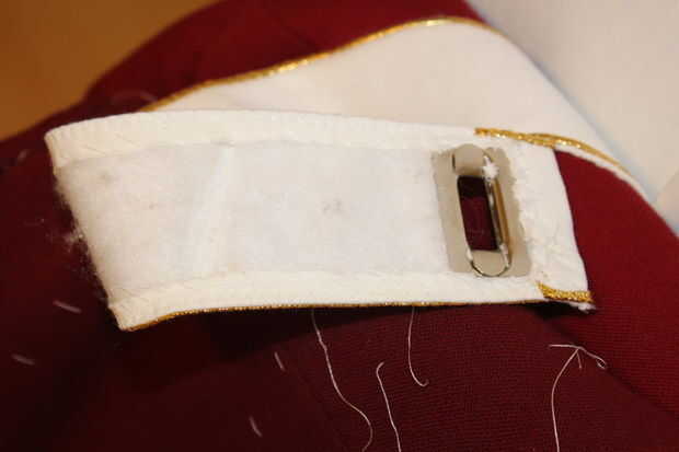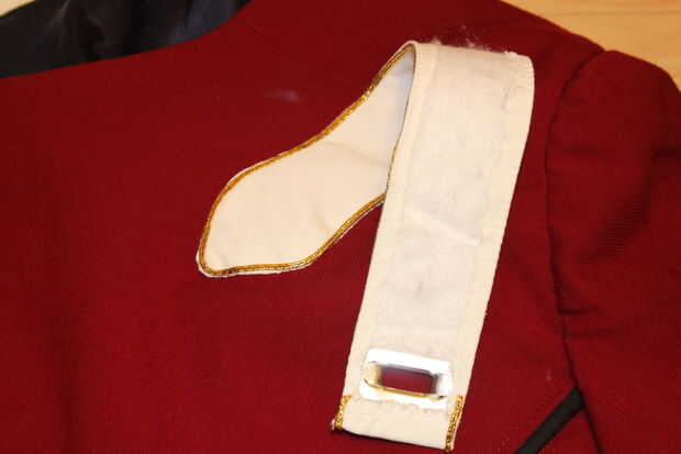 i. ajuste correa chaqueta y broche al frente, sobre el hombro y prender