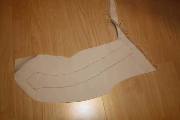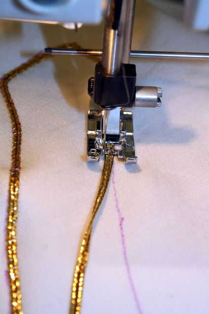 b. usando hilo de nylon, trenza de oro la puntada de zig-zag a lo largo dentro del contorno marcado (alimentados con el grano de la trenza para que no se atoren el pie prensatela, utilizar fray-check si es necesario)
