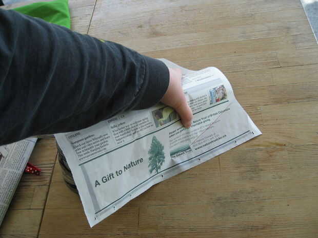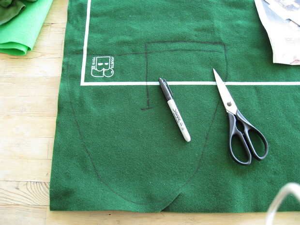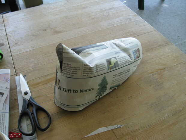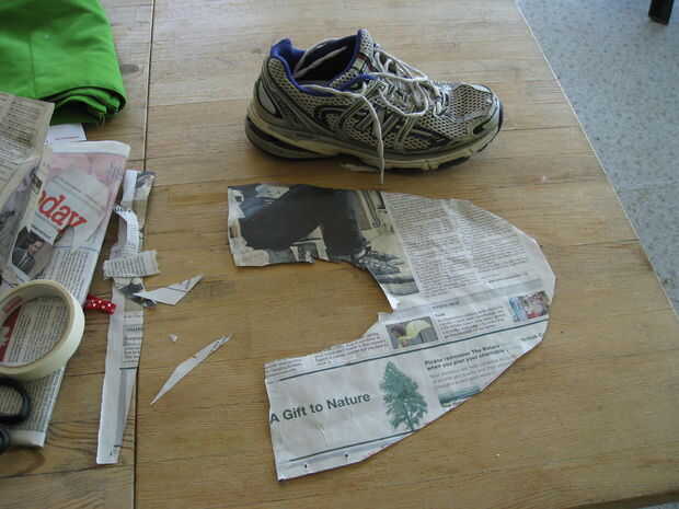 Para hacer botas de fieltro uso periódico para hacer un patrón sobre sus zapatos. Primero Envuelva una sola hoja de papel de noticias sobre la zapata y la cinta como se muestra. Recorte del periódico para que solo la parte exterior del zapato se cubre. Retire con cuidado la cinta y tienes un patrón para la parte inferior de la mitad de una bota. Cortar el diseño en fieltro (dejando una pestaña extra en un lado para pegar) y pegar la parte inferior de la bota a lo largo de la costura trasera. Recomiendo altamente a coser sobre esta costura a mano rápidamente para reforzarlo.