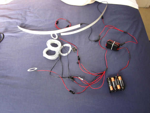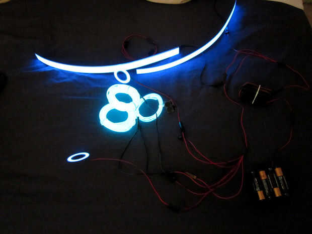 electrónica: 2 x 40cm luz azul EL cinta, 2 x 12cm luz azul "En forma de L" EL cinta, 4 aros EL x, 3 x 3m luz azul EL cable, splitters, inversor, batería. Conseguirlo todo en un paquete de EL arte de alambre