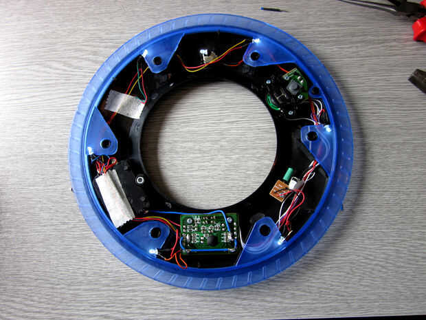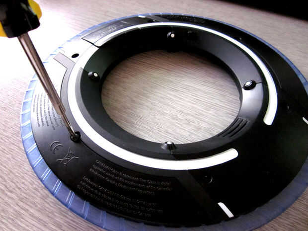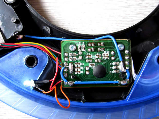 que enseñó a abrir el disco y modificarlo para que la luz se queda prendida continuamente. Necesita un pequeño destornillador, un soldador, alguna soldadura y algunos cables eléctricos delgados. Destornille los seis tornillos en la parte posterior del disco y levante suavemente de la placa. Ahora debería ver el chip que controla la secuencia.