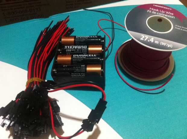 Mientras que usted está pidiendo las tiras de LED... era mucho más barato que comprar las otras cosas de electrónica en línea.  He utilizado conectores para entre piernas torso y brazos... asi eran extraíbles.  También compré algunos interruptores (para activar y desactivar) y baterías (tipo AA 8).  También haz un rollo de alambre calibre 22 (no sólida).