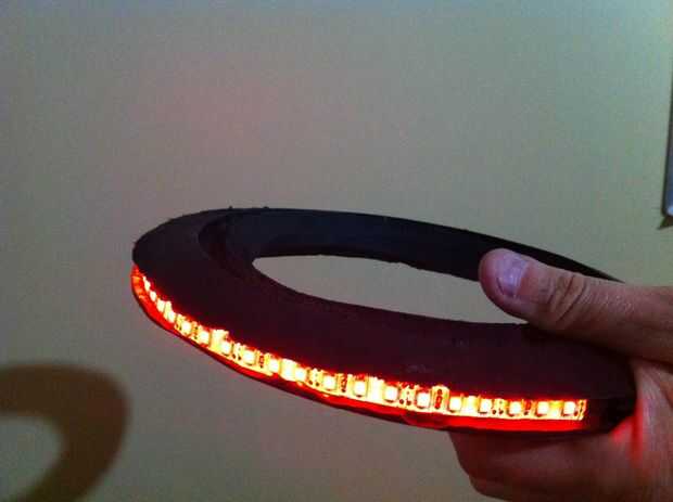 Además - me pareció beneficioso agregar un interruptor de encendido/apagado. Se seca la pintura - soldar el LED en el exterior borde interno surco y... todo alimentado por una batería de 9V. Duraría por sobre el uso de 2-3 horas sin parar para cada batería.