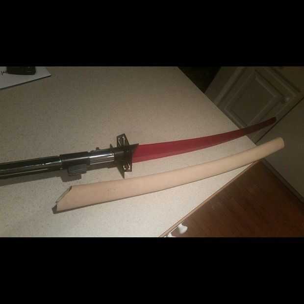 Una vez hice la espada katana de acrílico rojo y piezas de repuesto del fregadero. Necesitaba una funda de cuero para llevar la espada de katana en. He comprado una katana barata de ebay y he utilizado la funda de madera como una forma para mi piel. Usé un veg de 6 oz de piel curtida y de húmedo formaban el cuero alrededor de la funda de madera. una vez seco el cuero, quité la funda de madera y para sujetar la funda de cuero juntos. Utilicé un cemento de cuero base de agua que compré de Tandy.com teñido de negro y está listo para añadir la armadura para que sea completa.