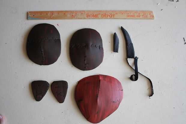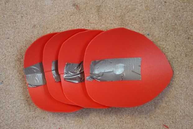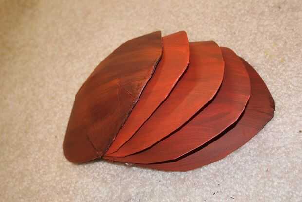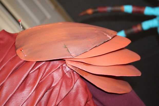 La armadura del hombro tiene 5 capas que yo suavemente curvado y usando cinta adhesiva en la parte inferior grabado juntos. La armadura del hombro se hace de una espuma de arte roja que he pintado con pintura marrón y naranja.