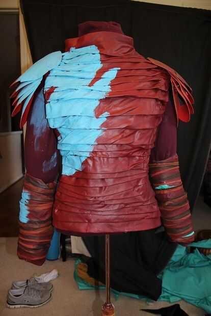 Hay poco detalles de armadura en la parte superior del traje. Estas piezas fueron hechas de espuma de artesanía. Las piezas circulares van sobre los hombros y los triángulos pequeños van en los codos. Después de que terminé con la pintura, pegué estos en el traje.