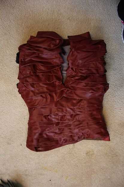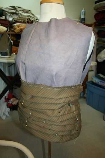 La blusa del traje está hecha de tiras de tela que se cortaron en tiras de 3 pulgadas. Hay 3 diferentes tejidos utilizados en la sección del cuerpo. Como las telas son similares el finalmente será buena. Una vez que la tela está pintada, las diferencias en la tela ya no son sensibles. Tengo una forma de cuerpo de mi tamaño que utilizaba para mantener el tamaño y la forma como fui formando en esta sección.
