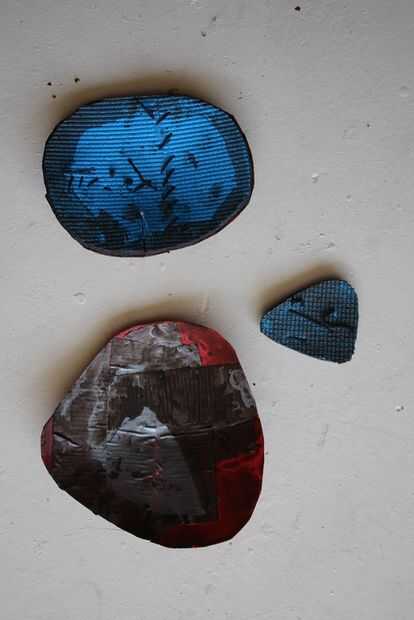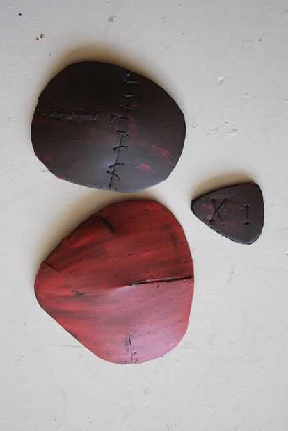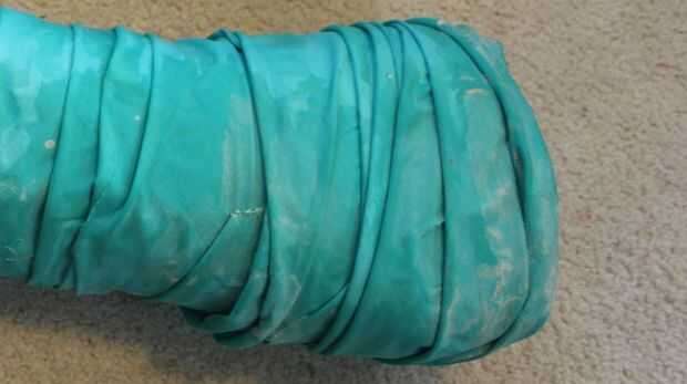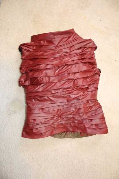 Mientras envuelve la sección del cuerpo dobla a la tela de abrigo en la mitad cuando fui a lo largo. El cection doblado de las tiras se ven los bordes crudos de las tiras de frente hacia la nuca. Como el cuerpo estaba envuelto hacia arriba sólo el lado doblado de la demostración de las tiras. Para mantener a la tela tiras en su lugar utilicé alfileres. El cuerpo fue luego pintado con una mezcla 50/50 de agua y pegamento blanco. Cuando el pegamento se seca el cuerpo entero era base recubierto con una pintura de Borgoña. Una vez seca se aplicó una capa superior de color naranja quemado.