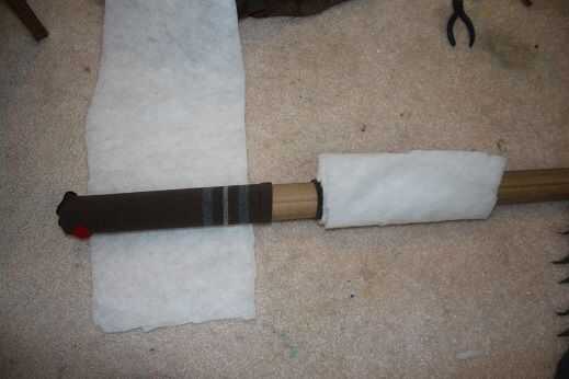 Para los guanteletes de brazo empecé con un par de calcetines de la rodilla que cortan los pies de. Los calcetines se desliza sobre un tubo de cartón y envuelto con tejido bateo. El bateo era cubierto con tiras de tela y luego pintado con una mezcla 50/50 de agua y pegamento blanco. El pegamento se deja secar y luego fueron pintados los guanteletes de la misma manera que las piernas del traje.