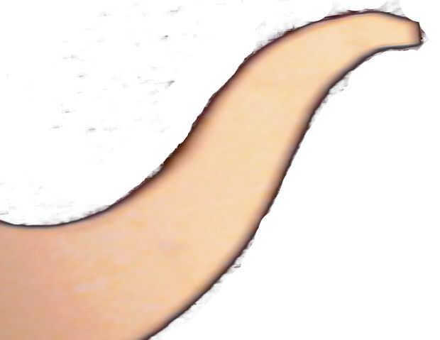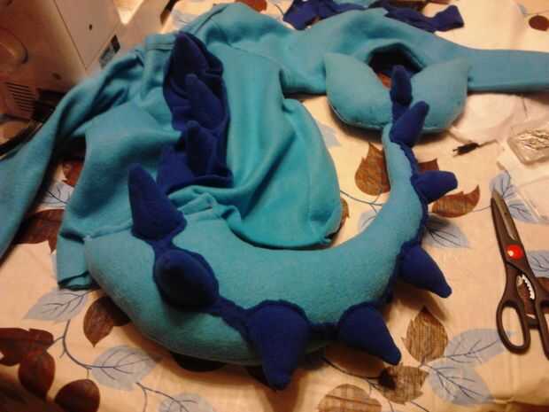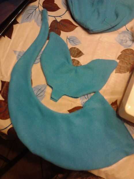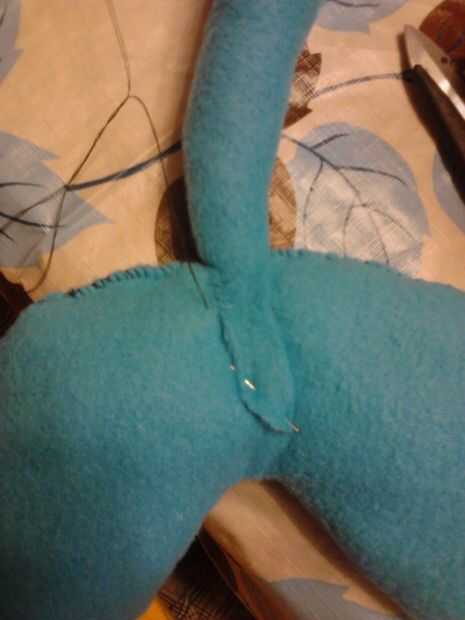 Partido los extremos del extremo pequeño de la cola de modo que un lado es a cada lado de la aleta caudal. PIN y coser juntos. (ver foto)