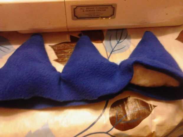 Alinear y fijar los triángulos de los picos. Coser los triángulos juntos pero deje la parte recta abierta. Hacia adentro hacia fuera y cada triángulo de la materia.