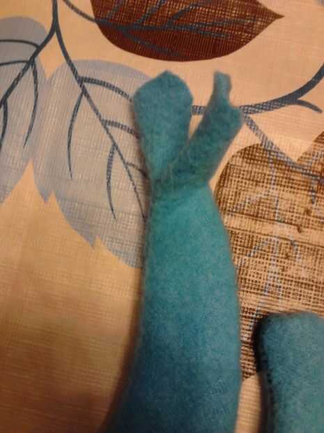 Alinee y prender las piezas de la cola. Coserlas juntos a partir el extremo más grande y bajando por el lado. Dejar un poco del extremo más pequeño abierto (ver fotos) y seguir la costura hacia abajo al otro lado en el extremo más grande. Vuelta adentro hacia fuera y esas cosas. Dejar los extremos abiertos.