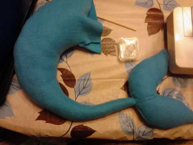 Alinee y prender las piezas de la aleta caudal. Cosalas juntas dejando una abertura de unos poquitos. tapa interior y esas cosas. Entonces pin y coser la abertura.