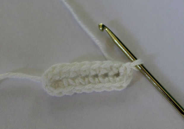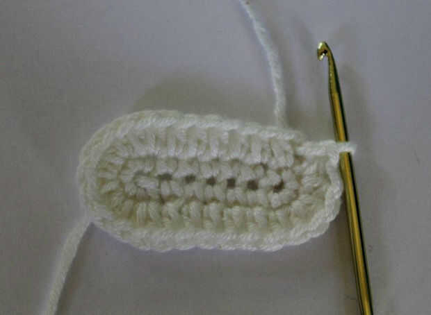 Ronda 1: Ch 8, sc segundo ch gancho y el siguiente 5 sts. 5 sc en pasado st (dedo del pie del zapato). En el lado opuesto de las cadenas, sc en próximos 5 sts, (talón del zapato). Trabajo 2 sc en pasado st, st sl a unirse. (total de sc 19).