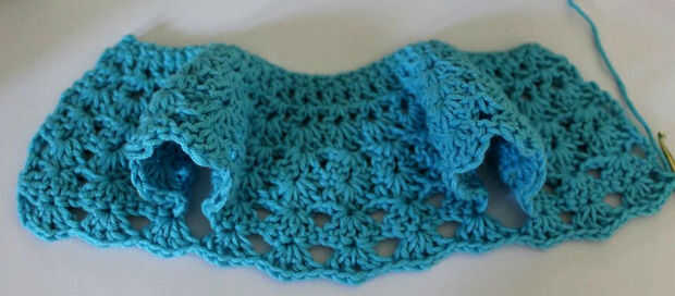 Fila 7: ch 3, hacer una concha en cada una de las tres conchas de la hilera anterior, saltar cuatro granadas, entonces hacer cinco granadas de, saltar cuatro granadas, después hacer tres obuses en las últimos tres conchas de la hilera anterior. C.c. en el último st. Las ocho conchas que omiten son para las dos mangas.