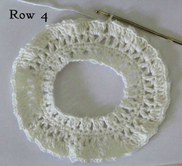 Ronda 4: ch 3, * 1 cáscara en ch-1 espacio de la V-st, repetir de * a * hasta el final de la ronda, sl st a ch 3.